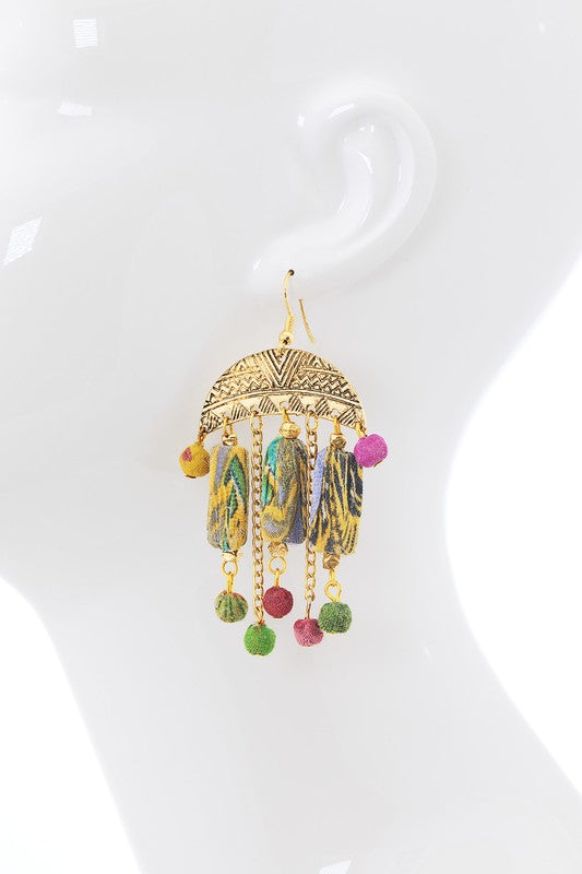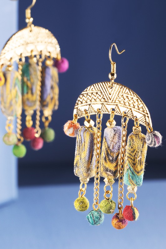 Exquisite moon shaped brass earrings with hand-wrapped cotton beaded accents