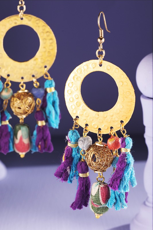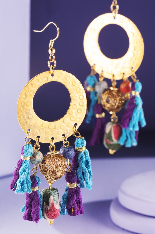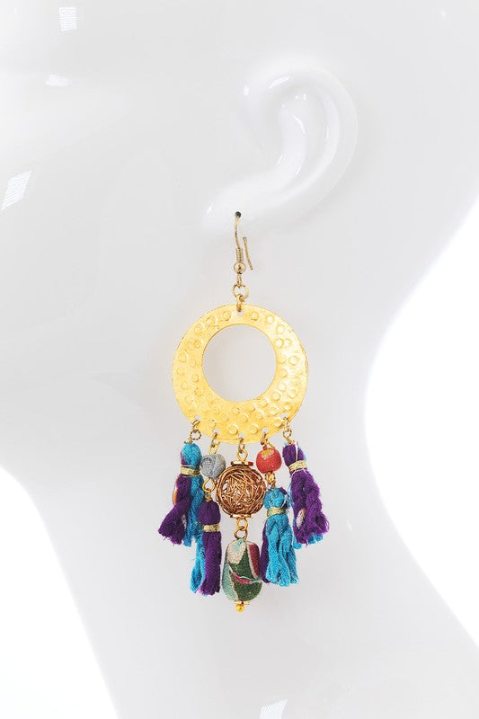 Magnificent embossed brass hoop earrings with hand-wrapped cotton beads and brass orbs and tassels