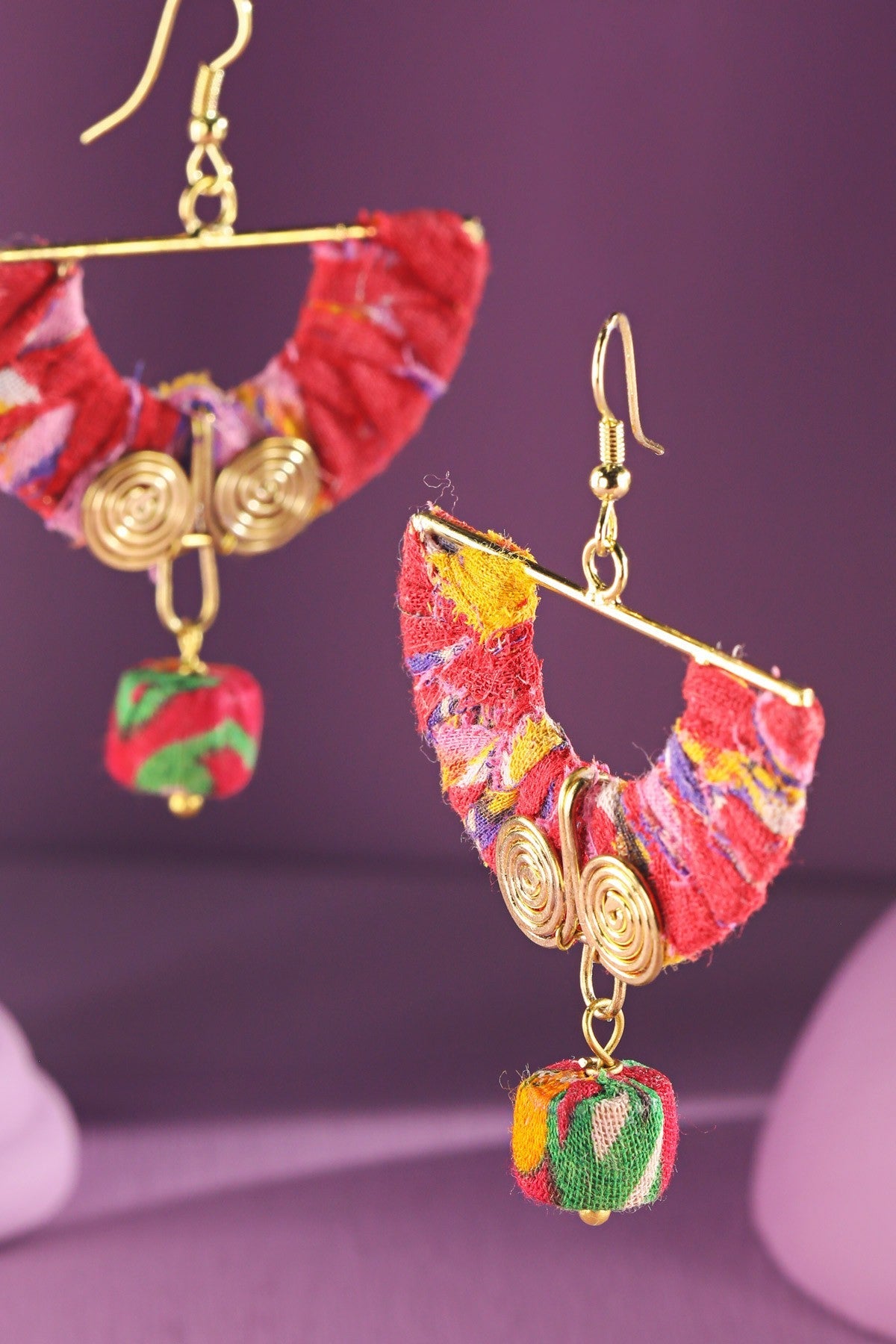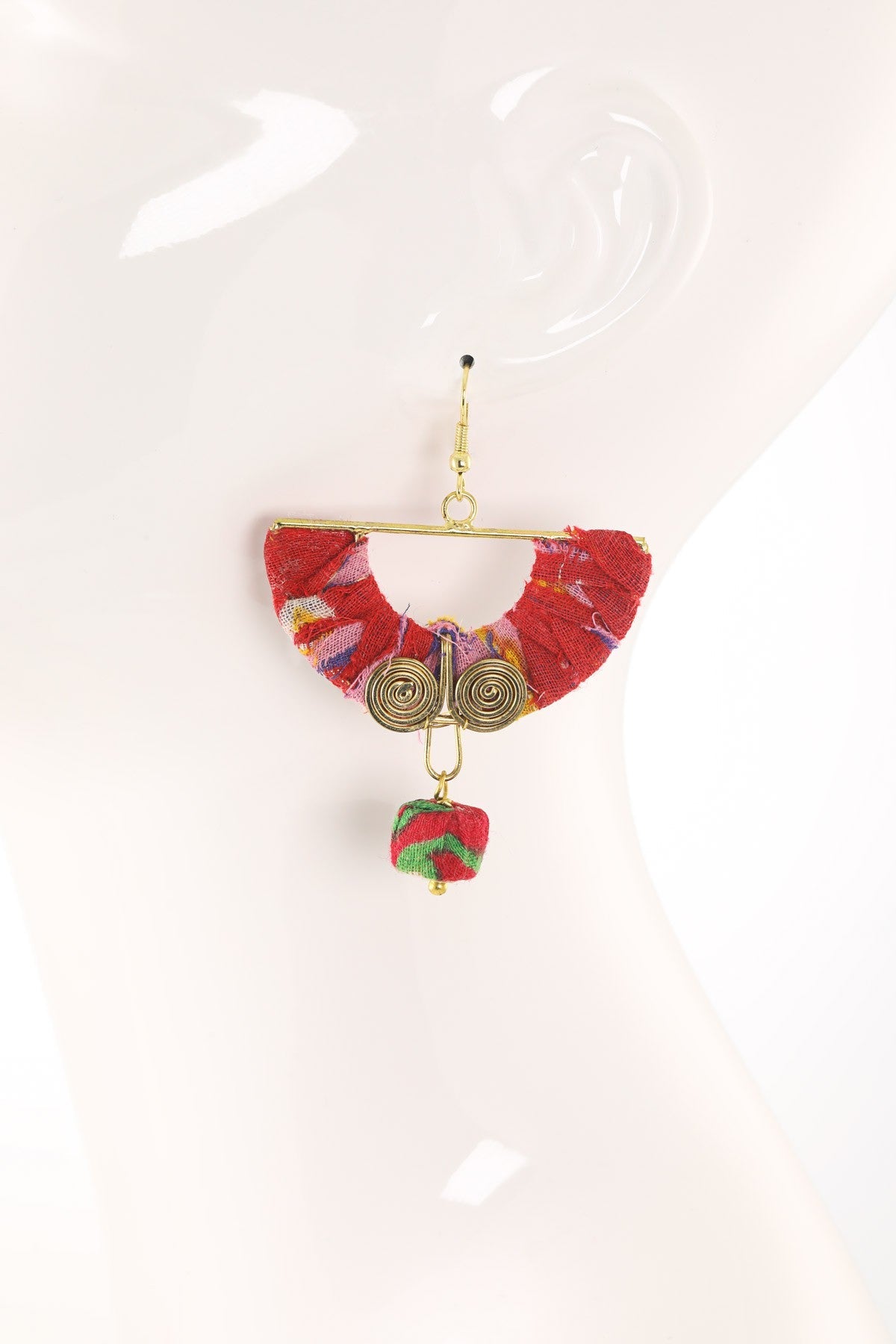 Fabulous handmade arch and spiral fan earrings crafted from cotton fabric and brass, showcasing a unique spiral design.