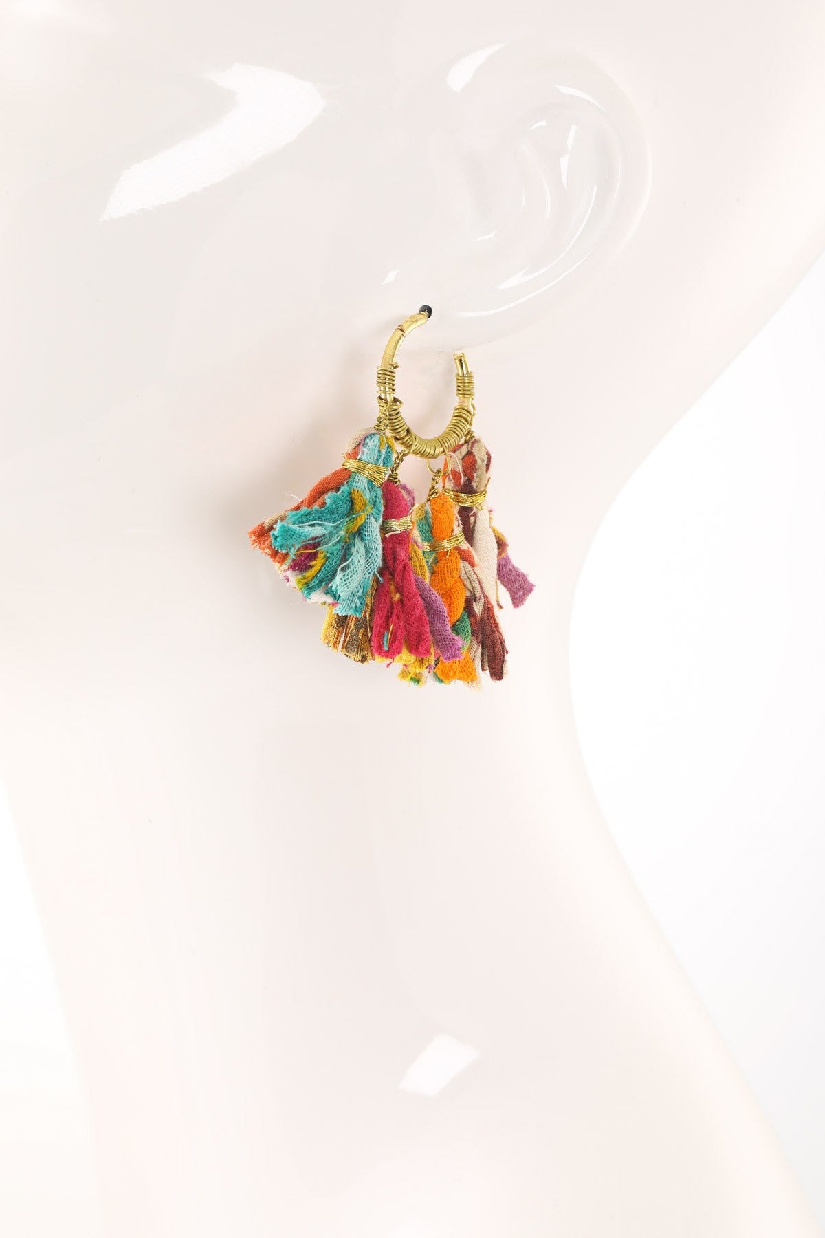 Elegant brass C-hoop earrings with upcycled sari tassels