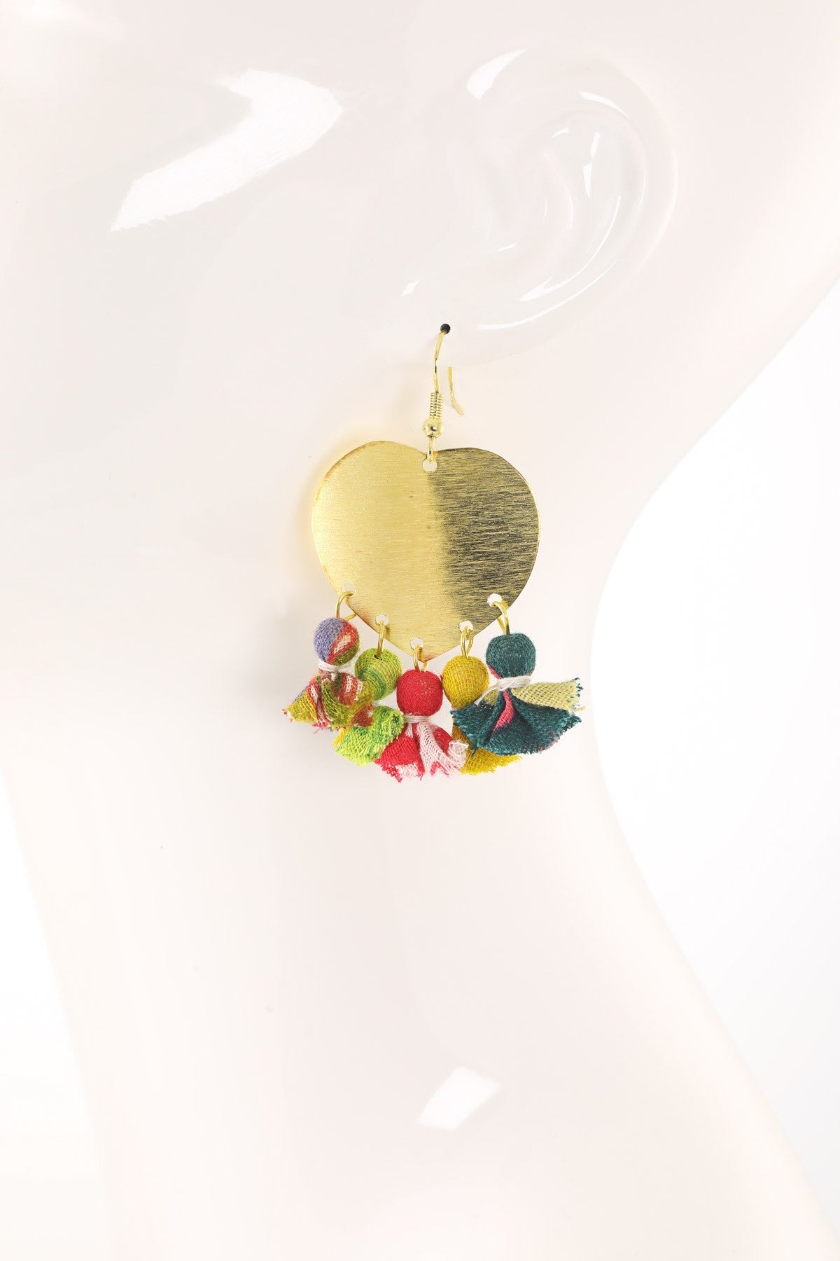 Adorable handmade heart dangle earrings with hand -wrapped cotton tassel accents.