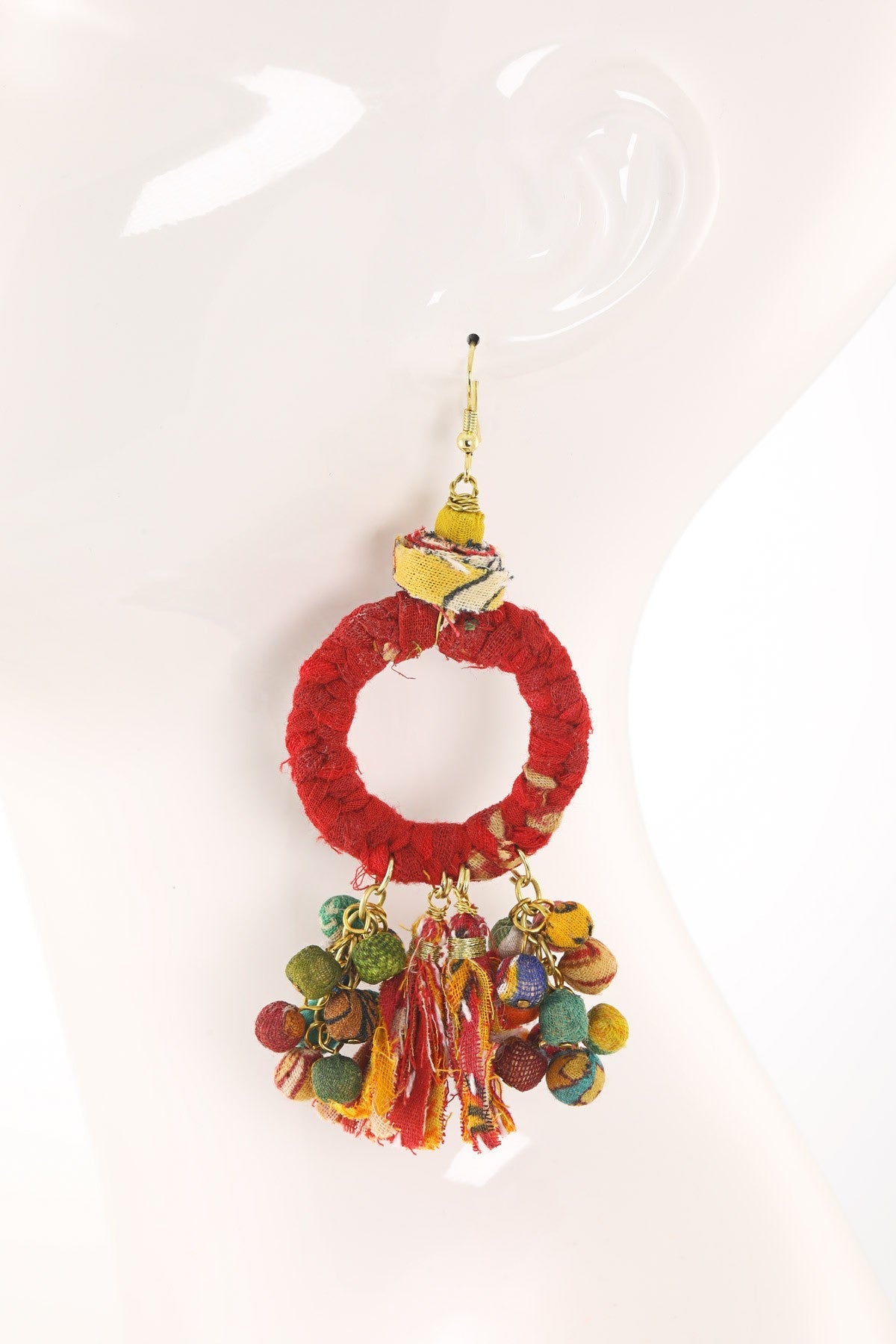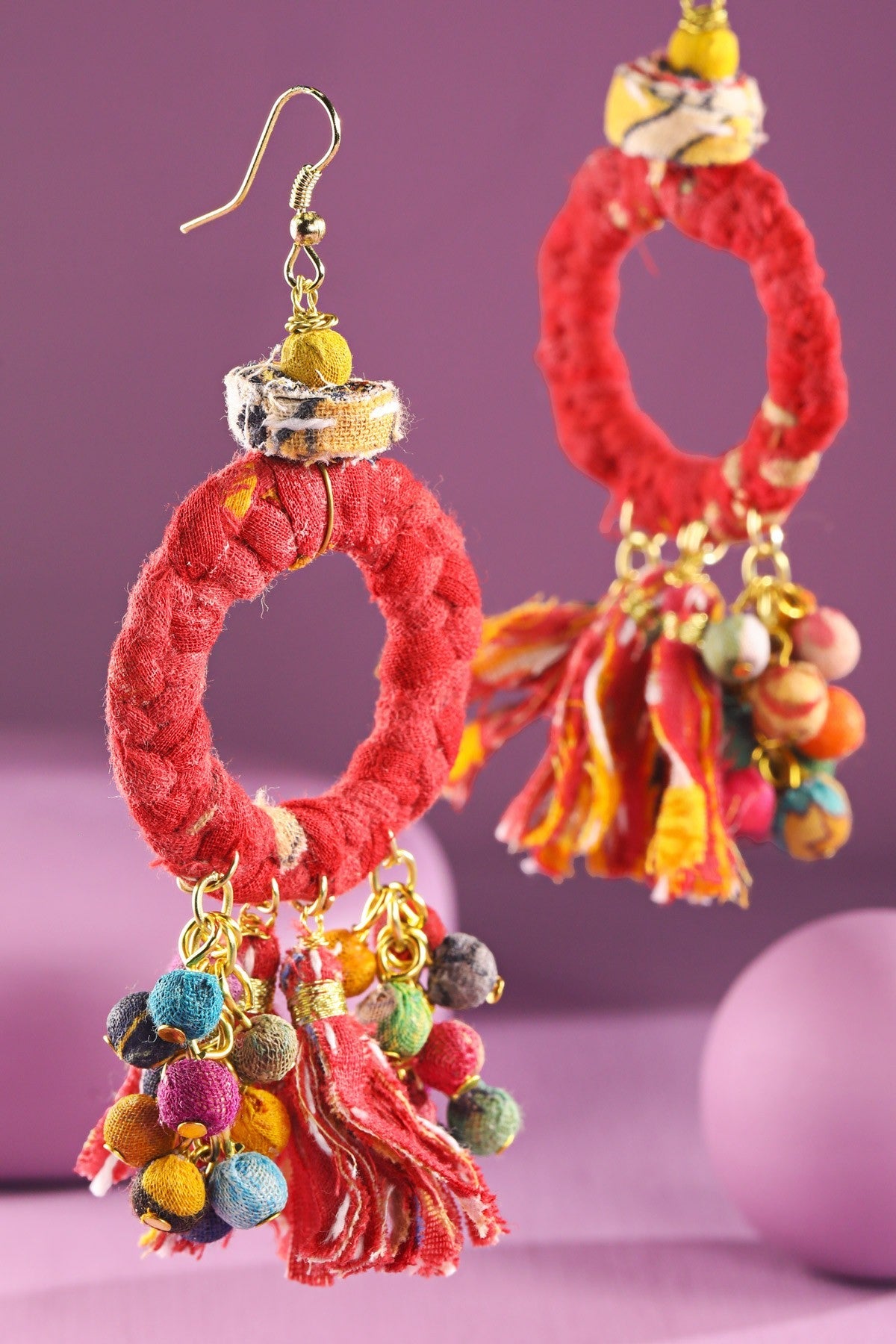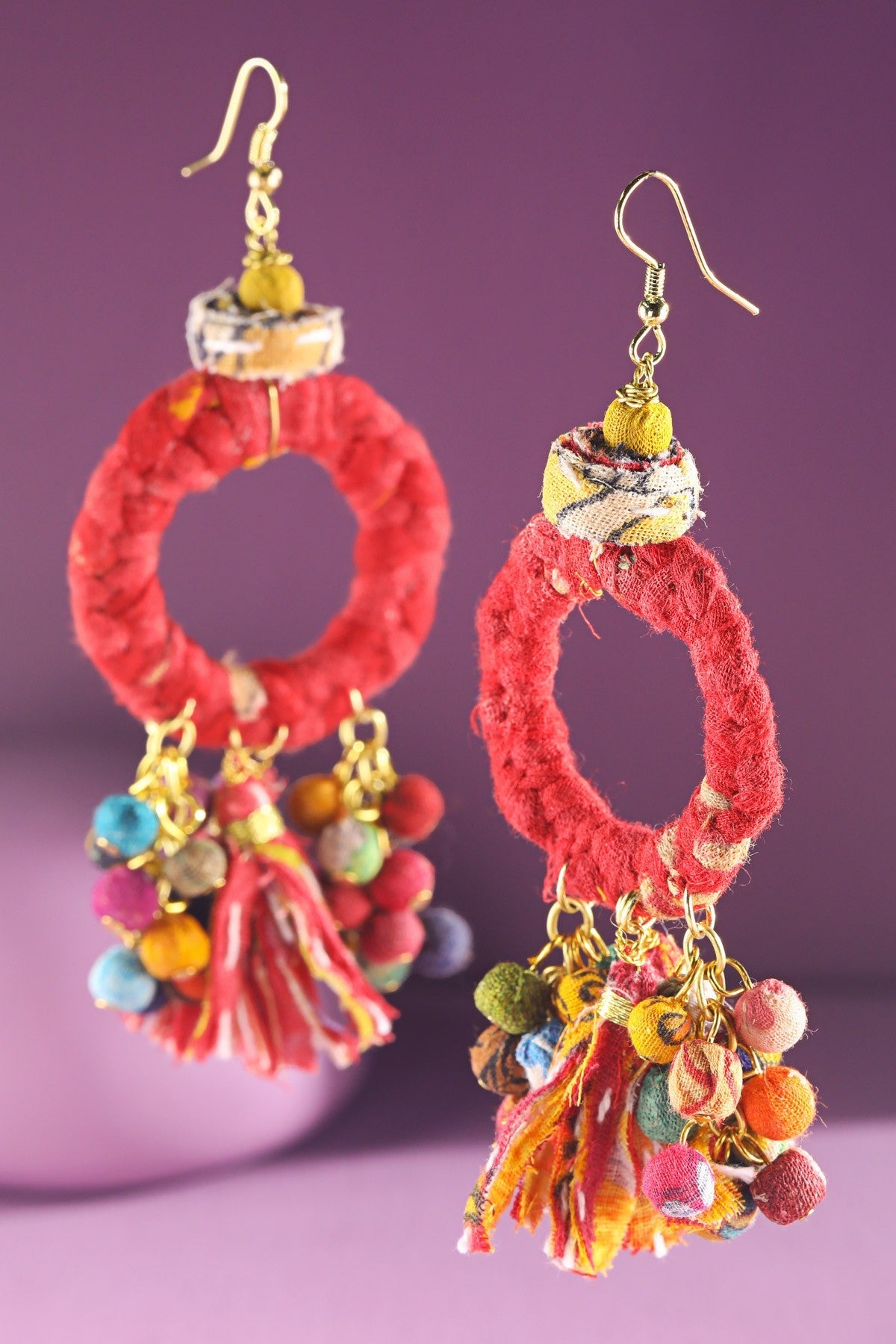 Beautiful hoop earrings with hand-wrapped cotton bead and tassel accents