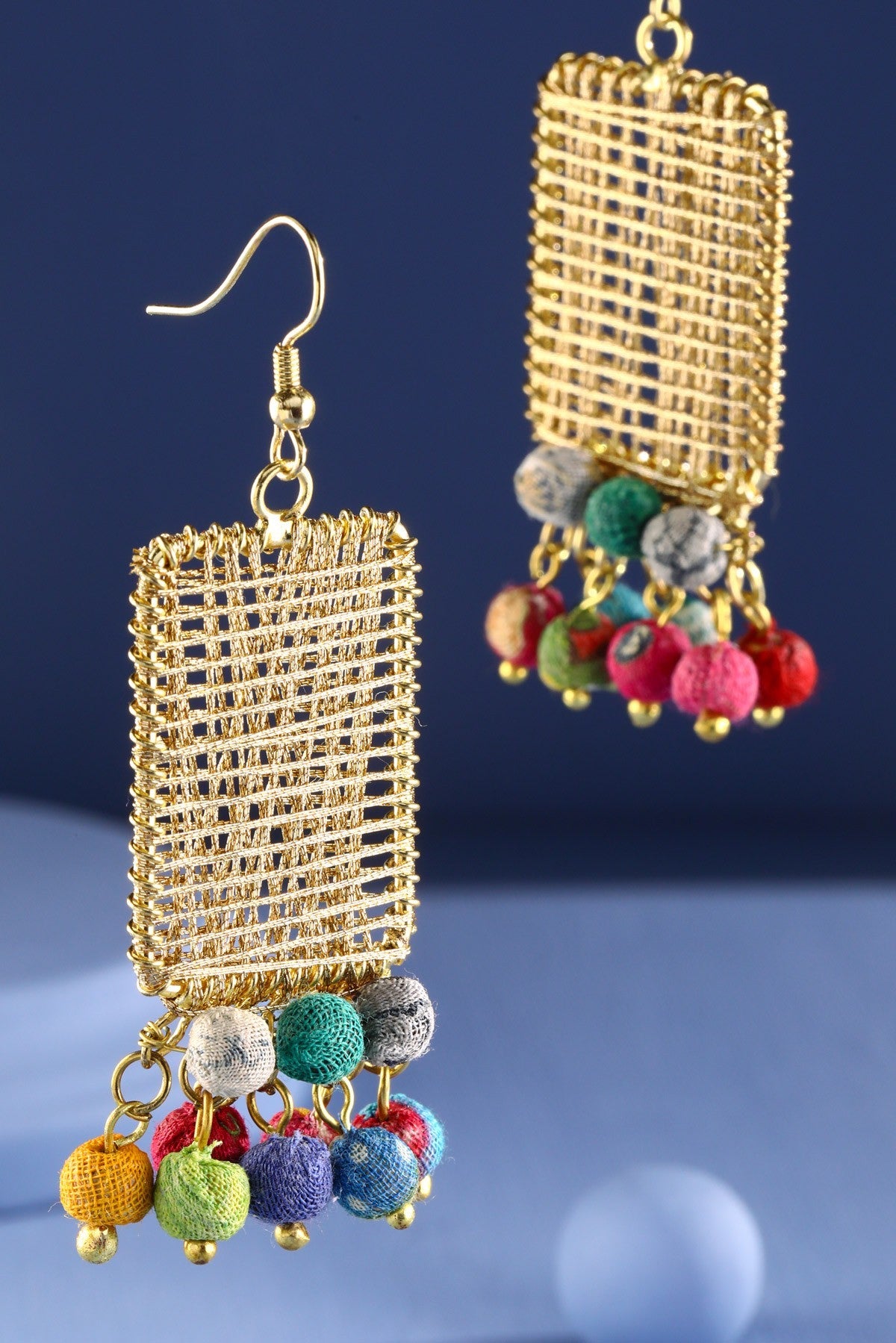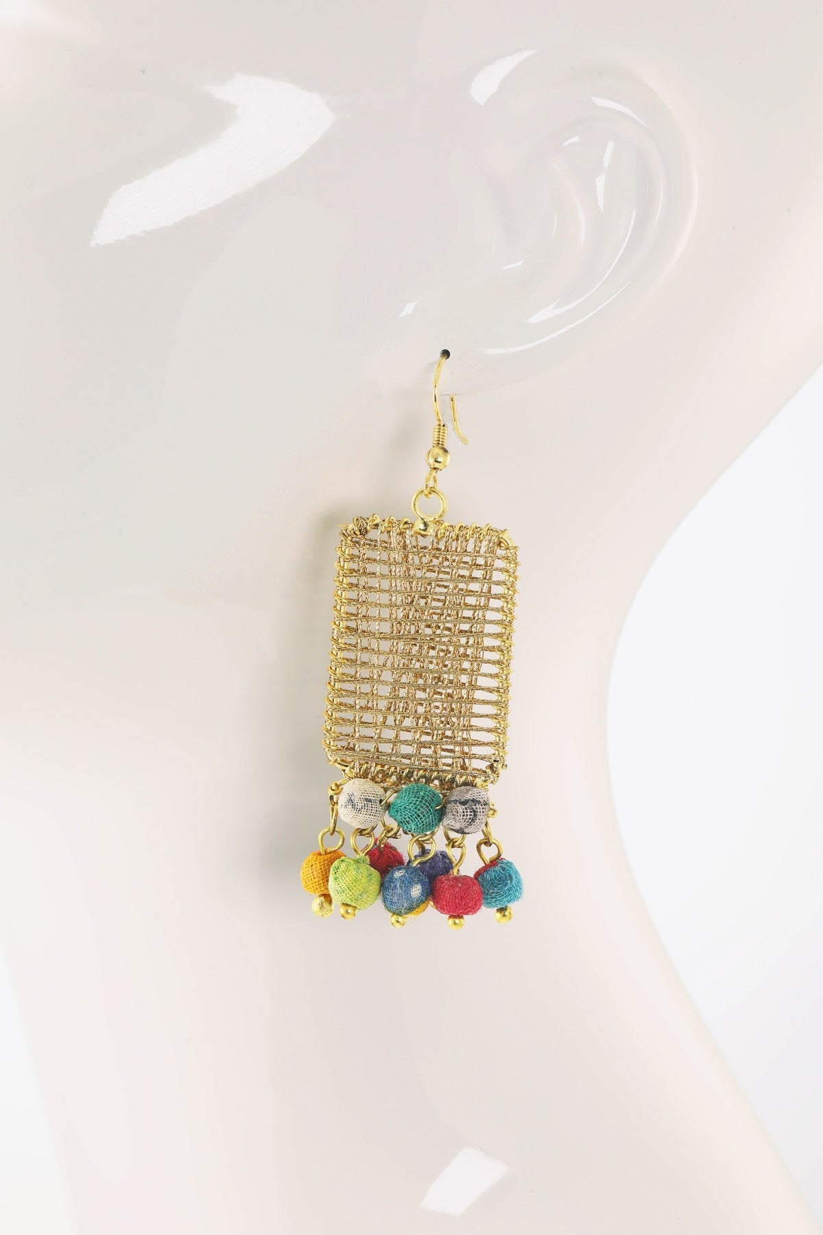 Unique handmade rectangular mesh wire drop earrings adorned with hand-wrapped cotton bead accents for an artistic touch.
