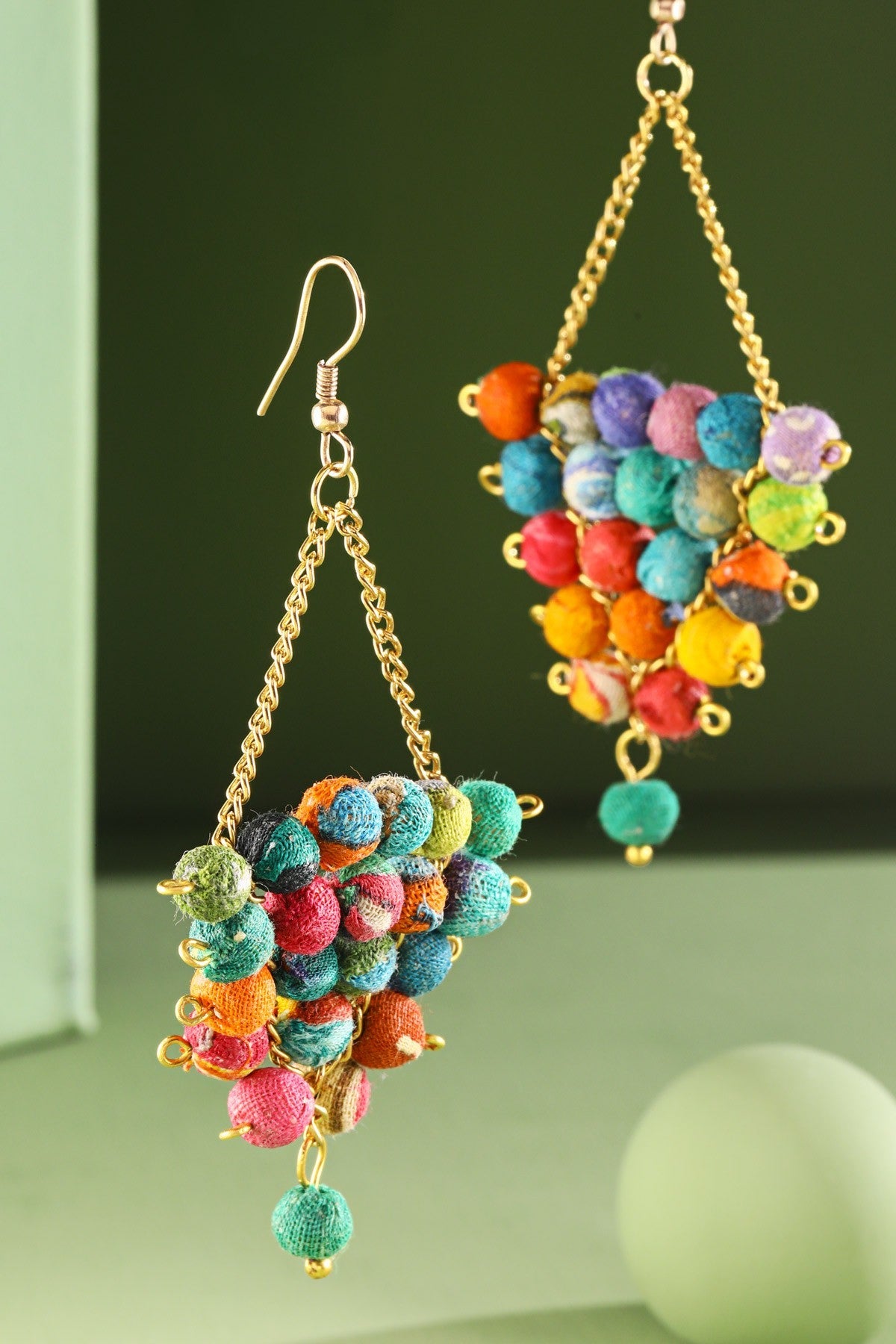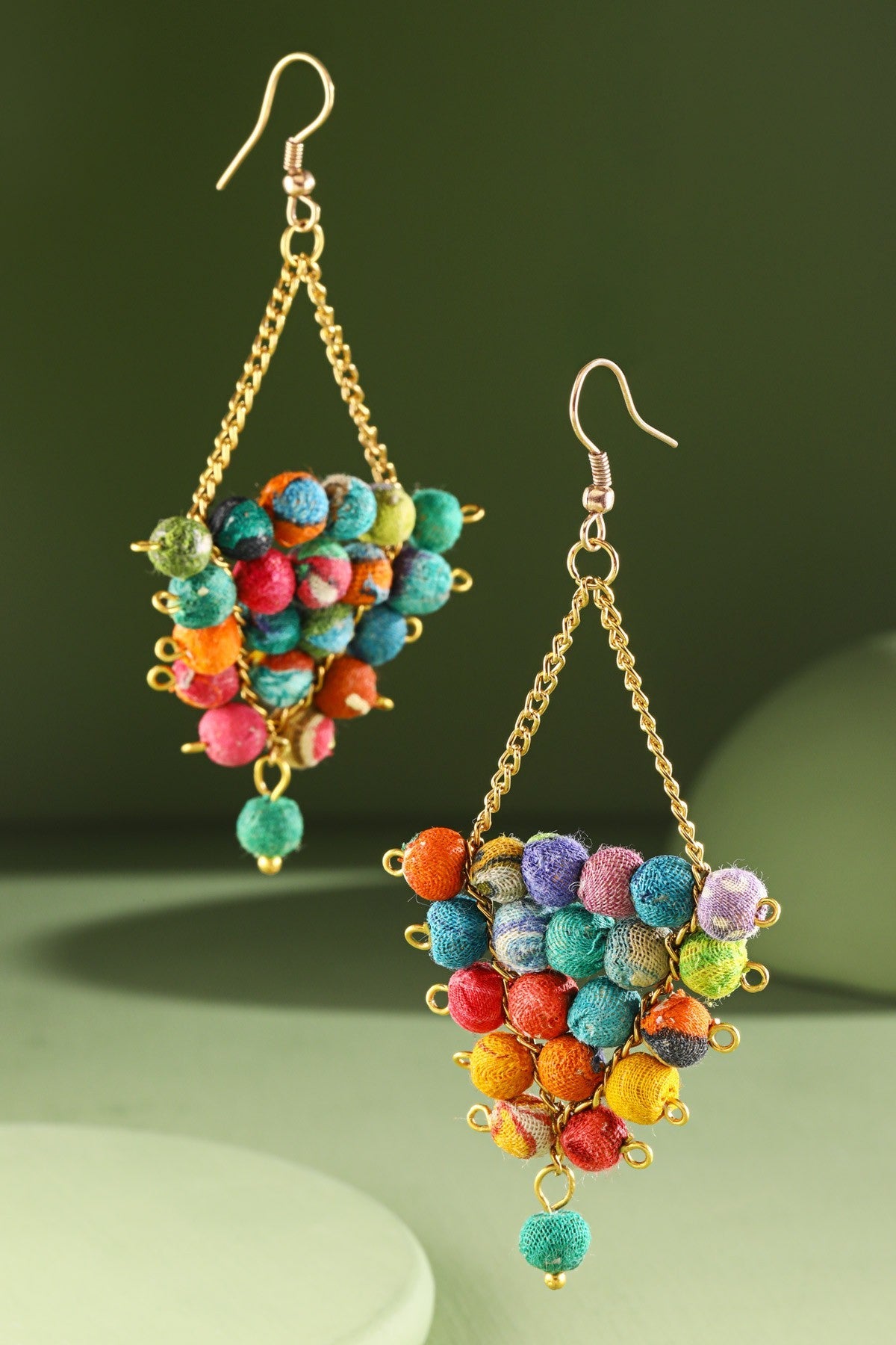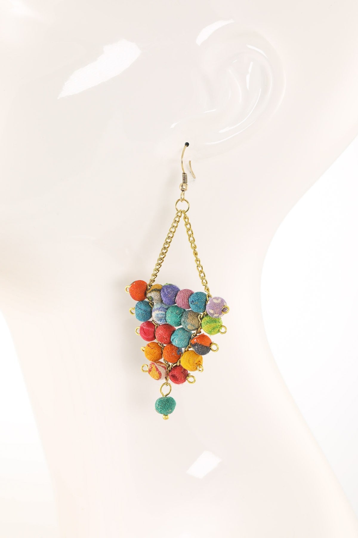 Distinctive dangle triangle earrings featuring bold chains and intricate hand-wrapped cotton bead accents.