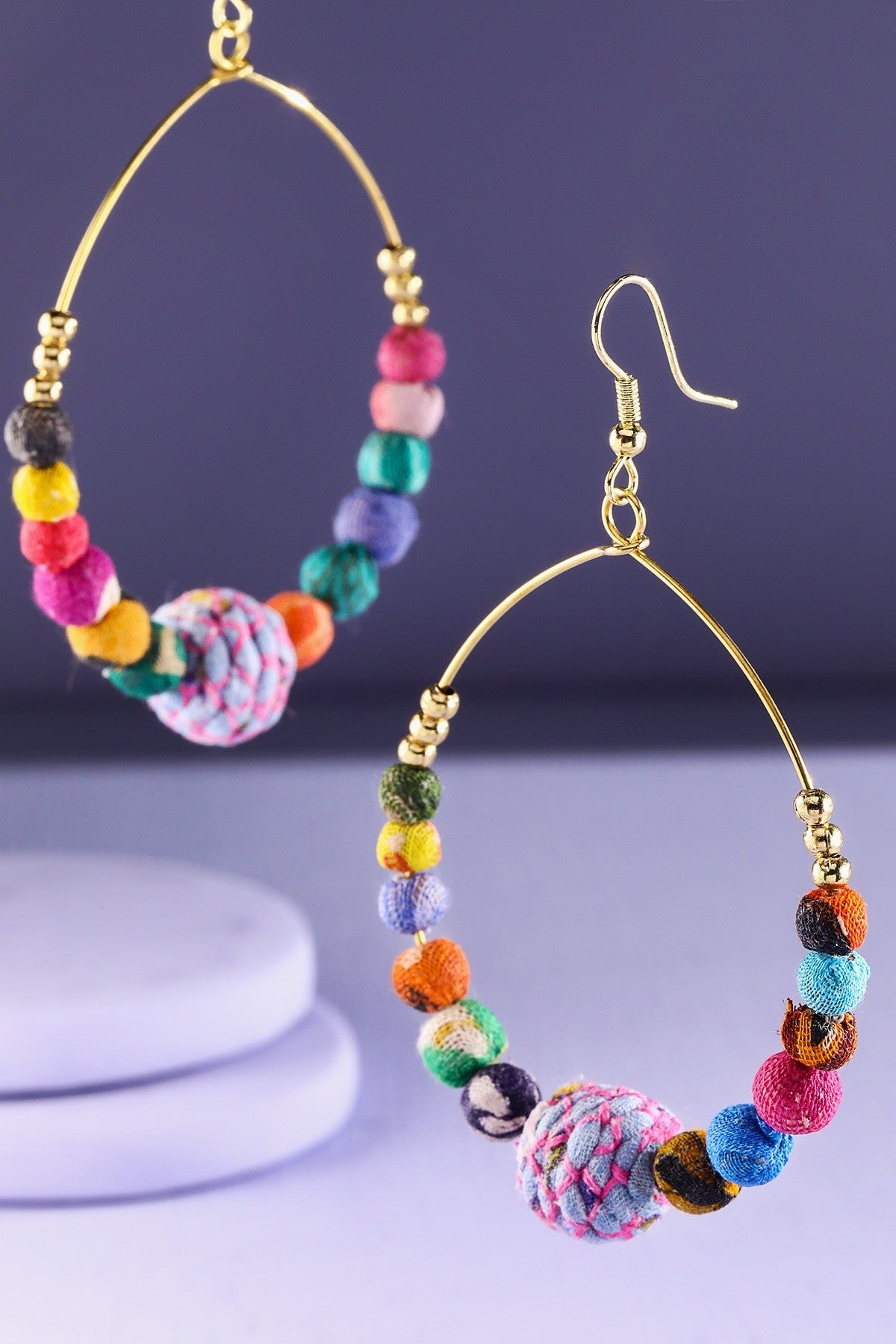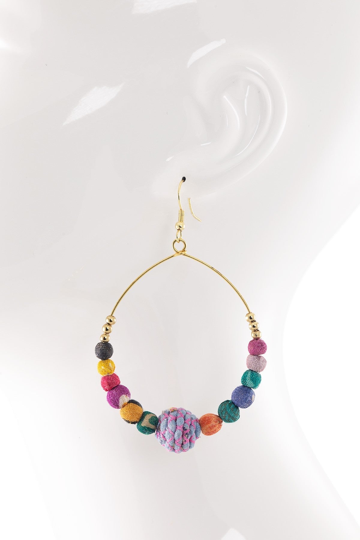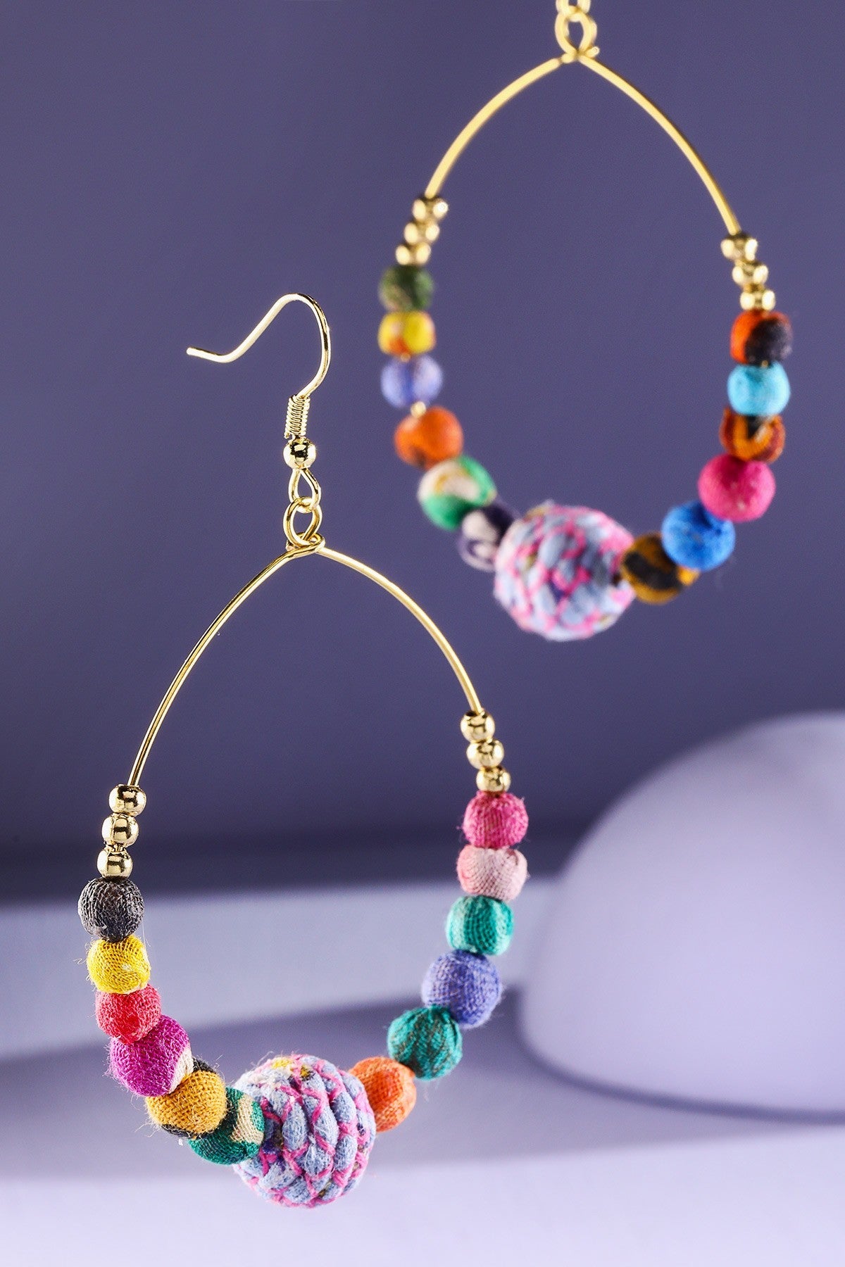 handmade wire hoop earrings with hand-wrapped cotton bead accents.