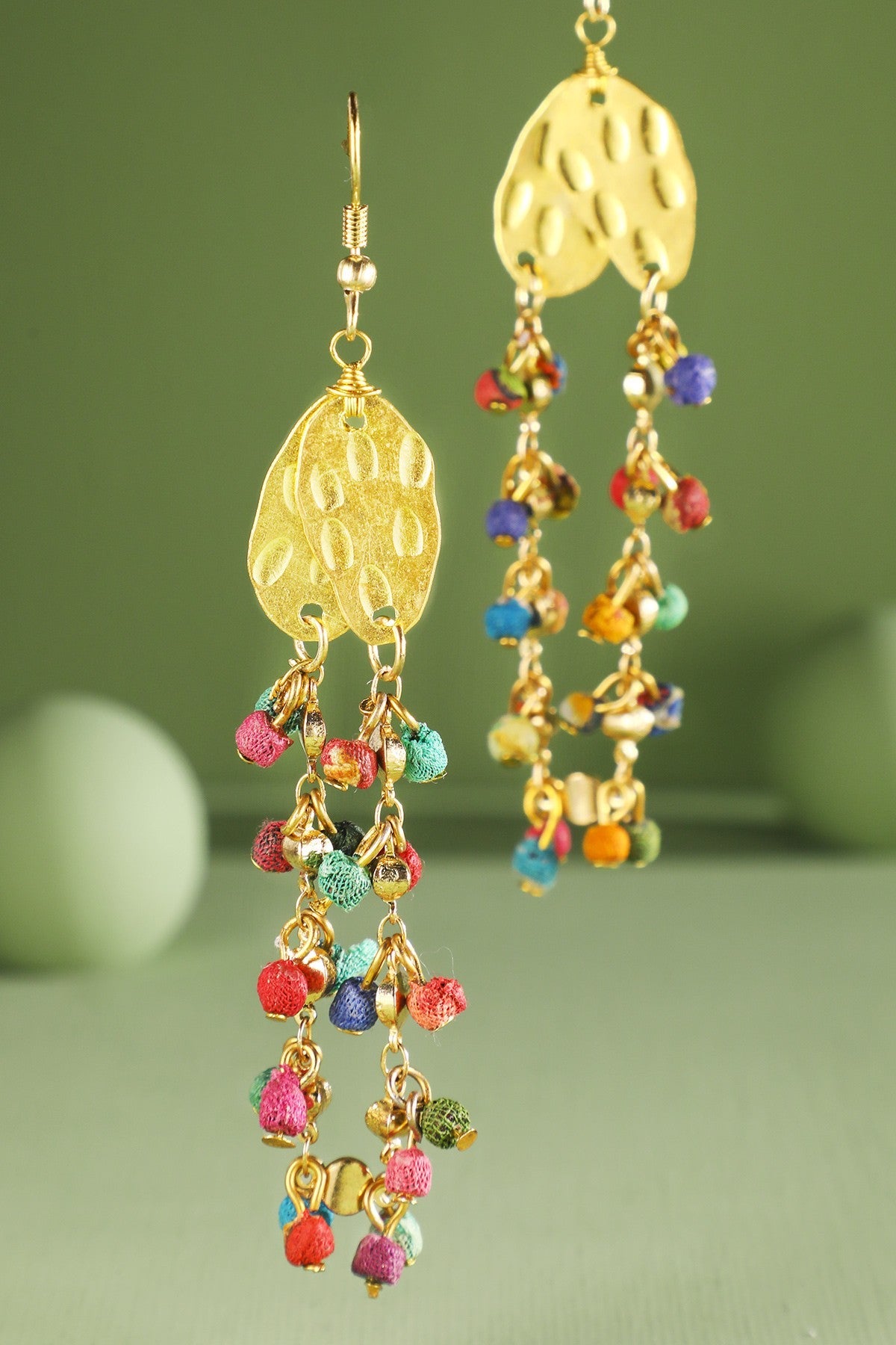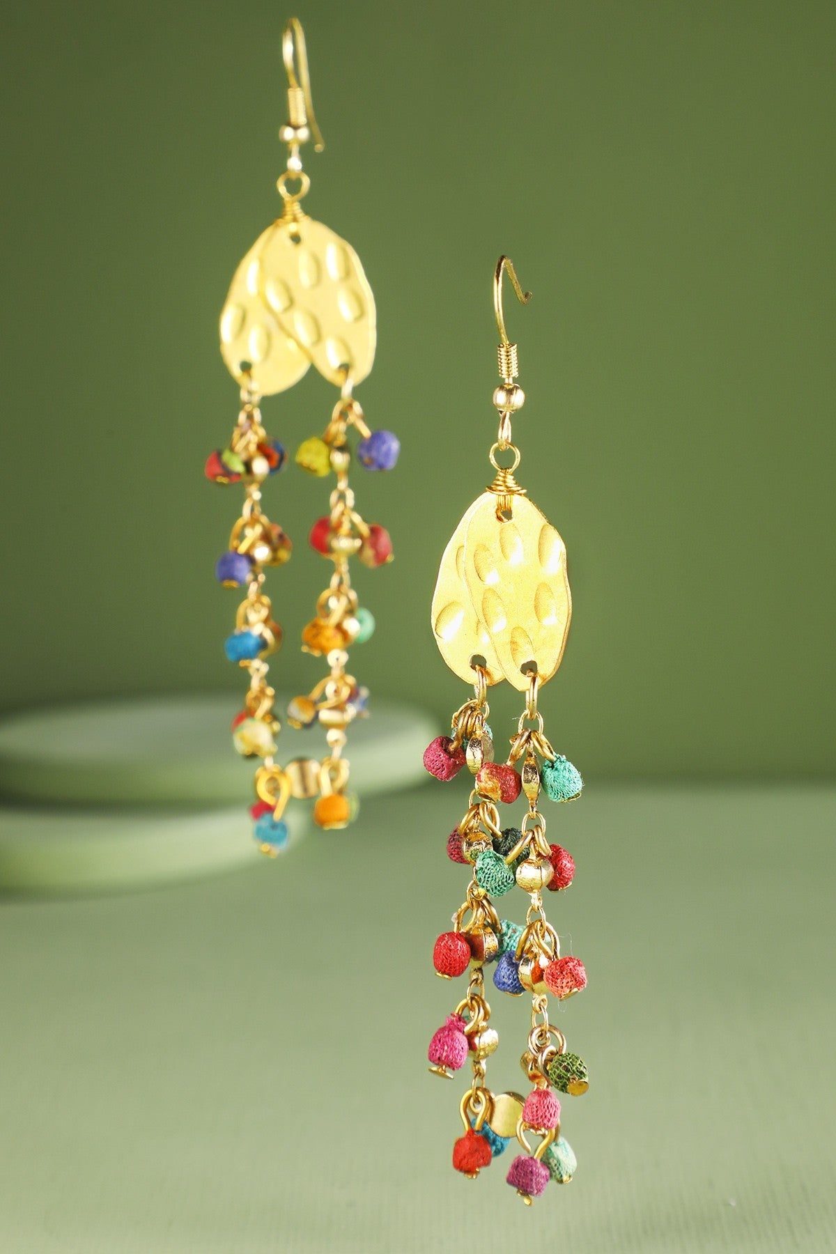 These earrings feature a bold and intricate design. They are composed of two large, hammered metal discs as the main focal point, with a cascade of colorful hand-wrapped cotton beads dangling from each disc and connect at the bottom.
