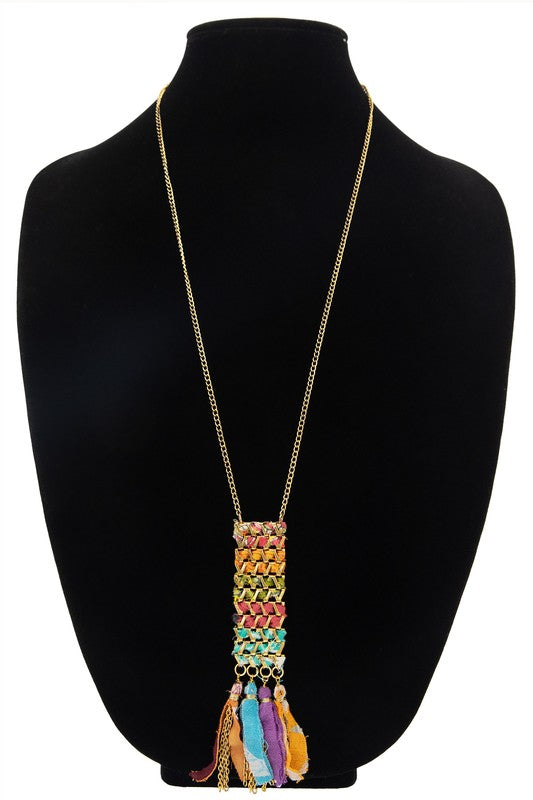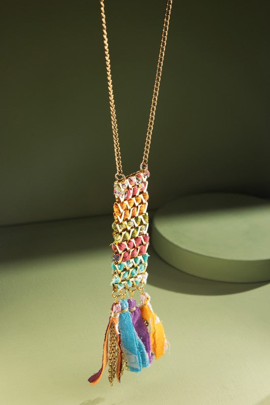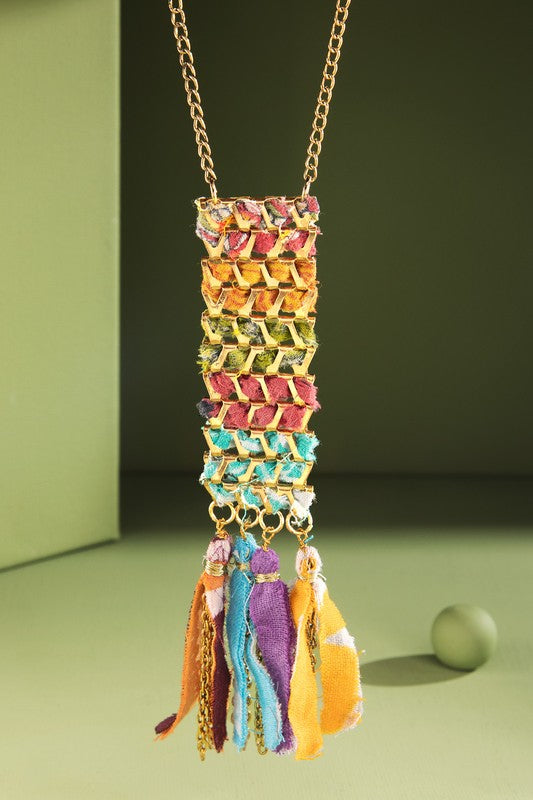 Vibrant woven cloth necklace with fabric dangle accents