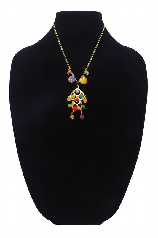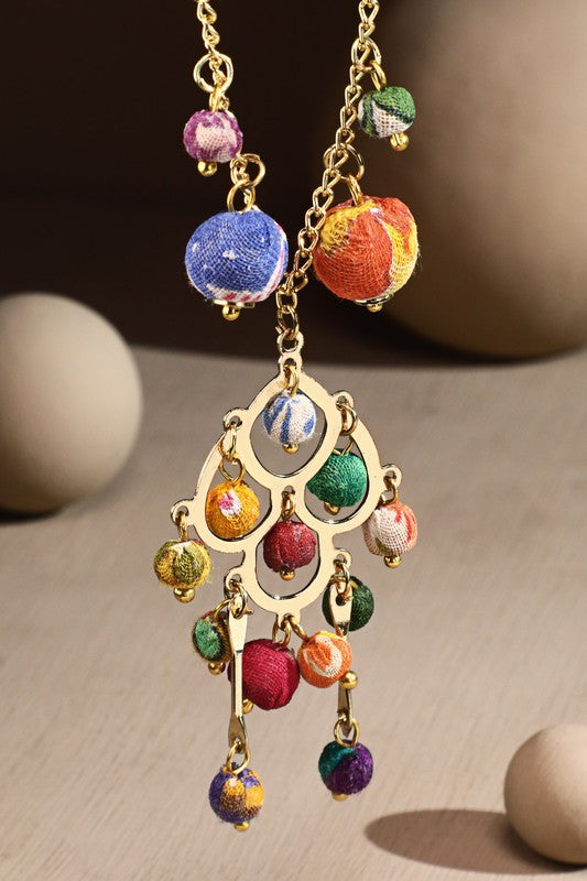 Gorgeous hand-wrapped cotton beaded chain link necklace with intricate brass design & cotton beaded dangle accents
