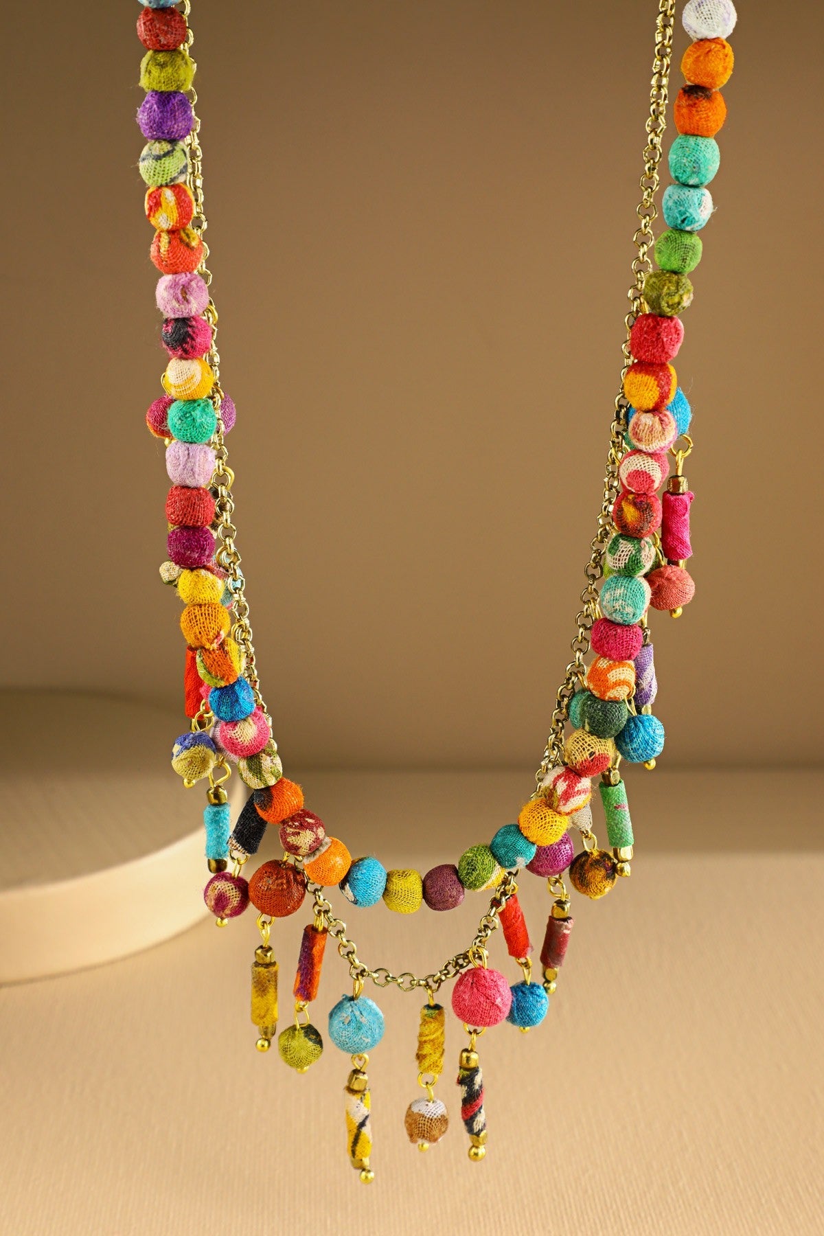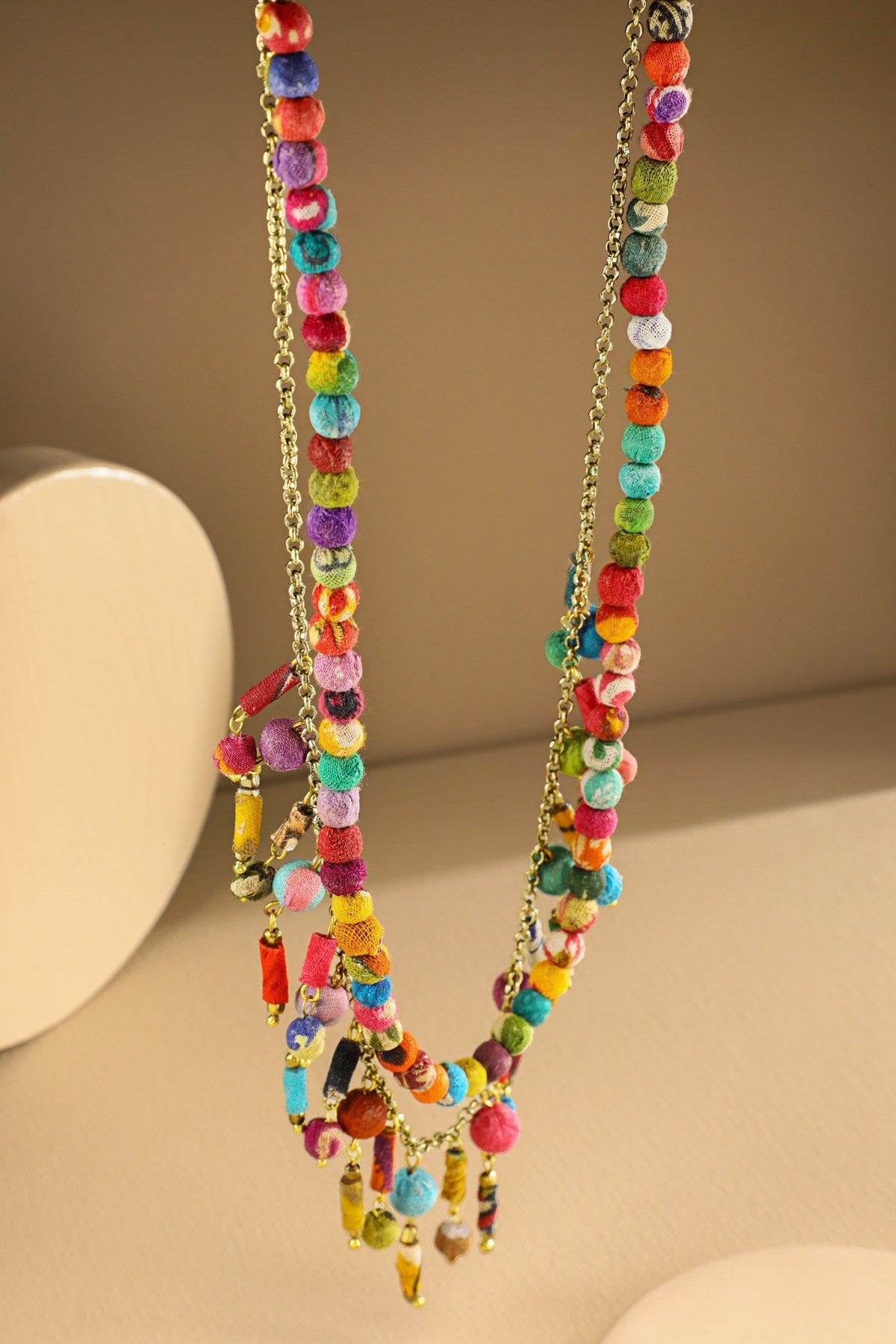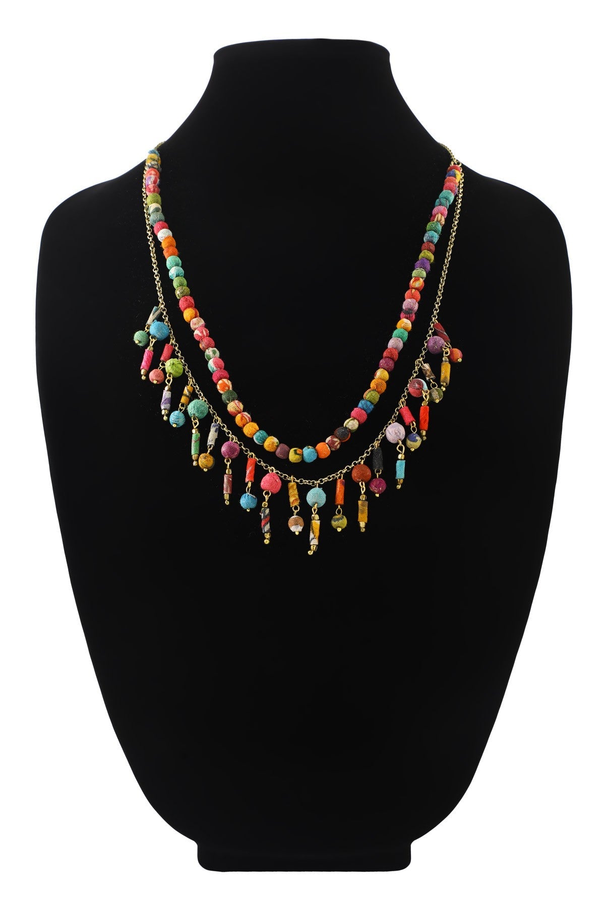 Sophisticated handmade necklace with circular and tube beads in layered design for a polished, contemporary feel.