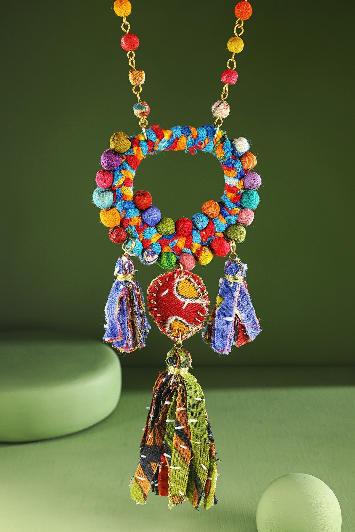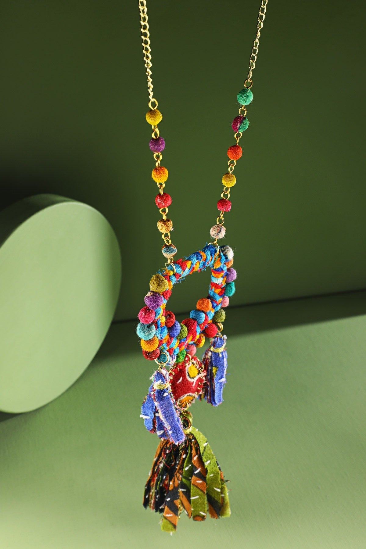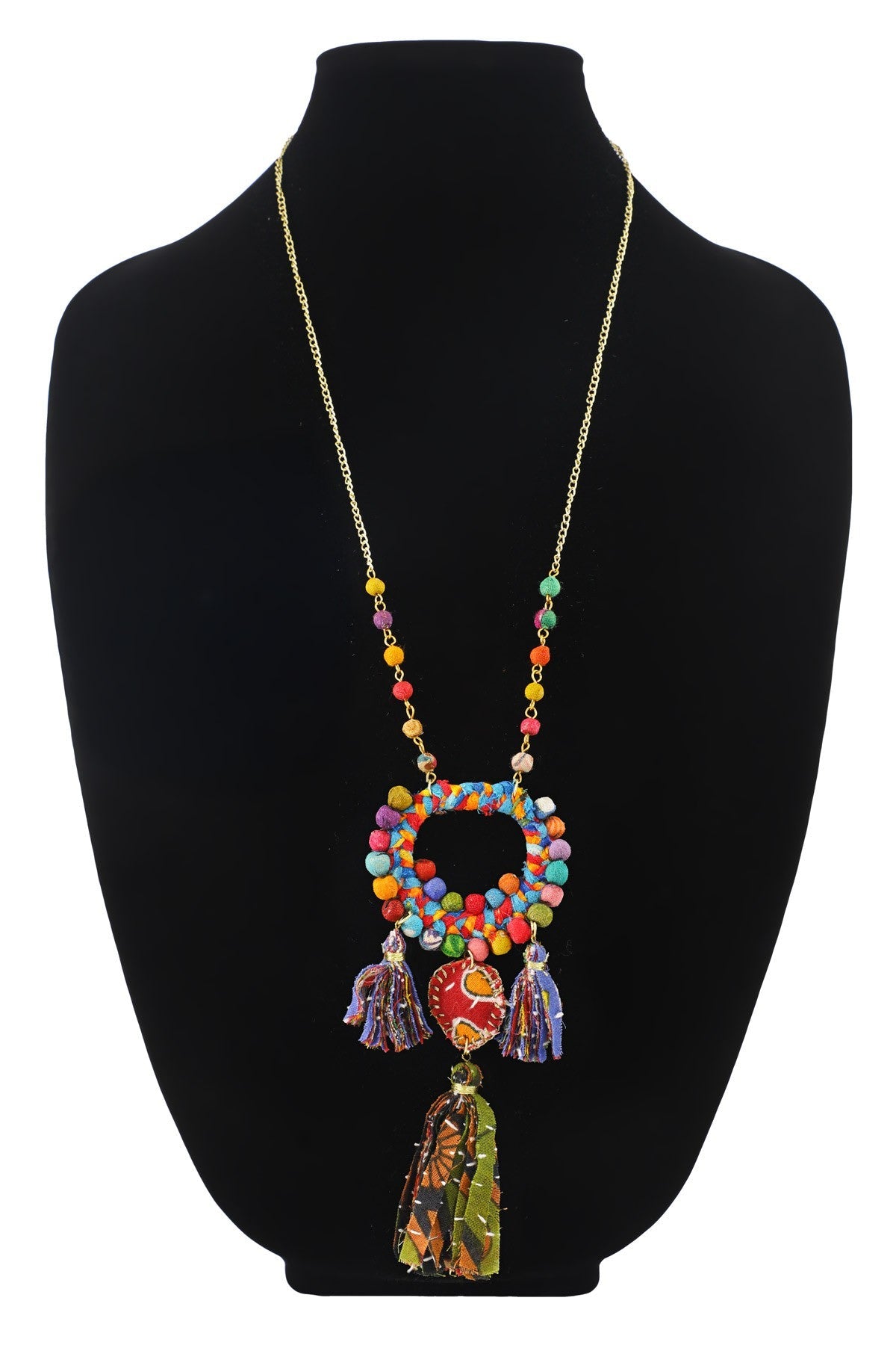 Expressive chain necklace adorned with a hand-wrapped cotton beaded pendant and playful tassels for added movement.