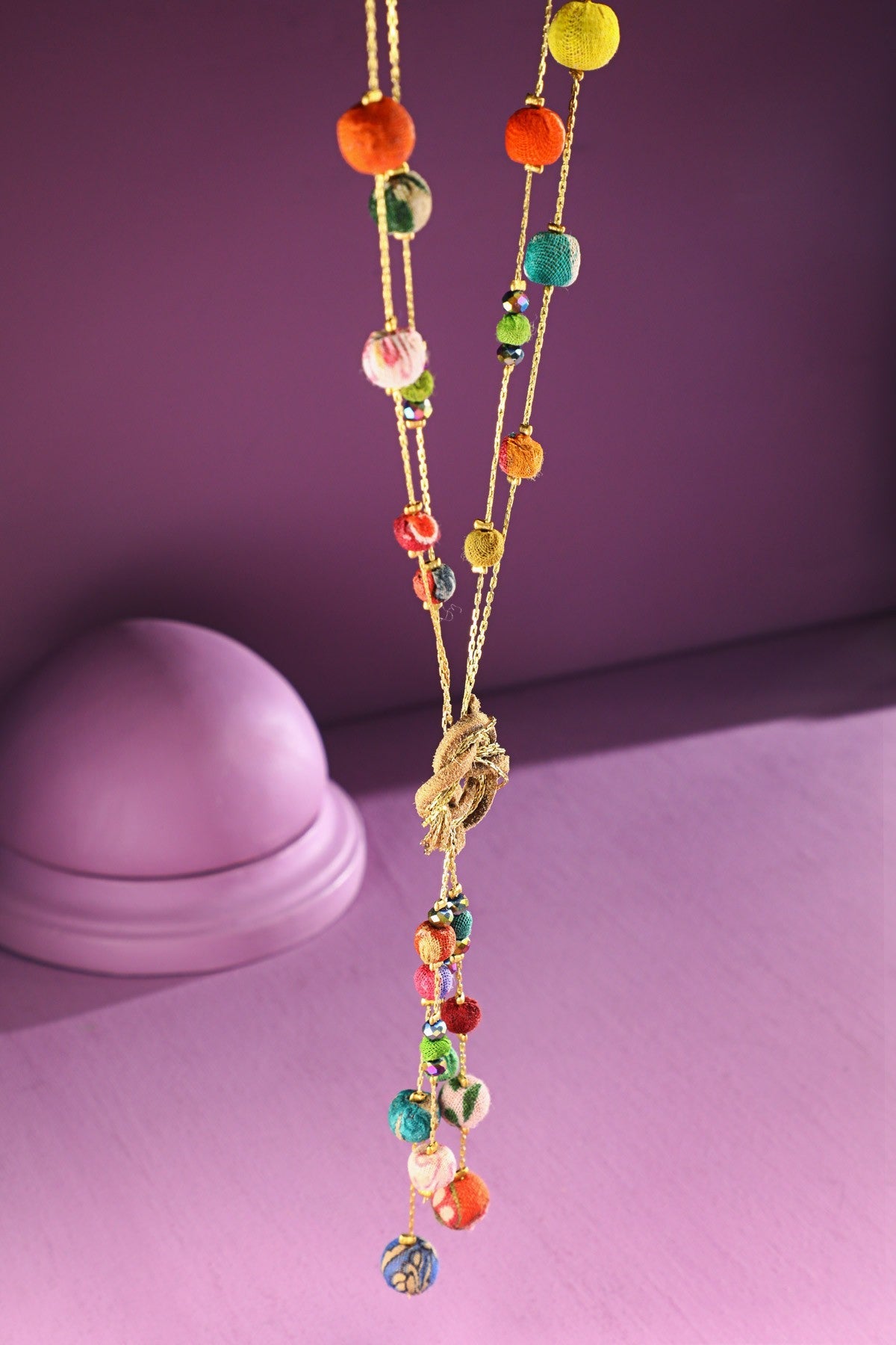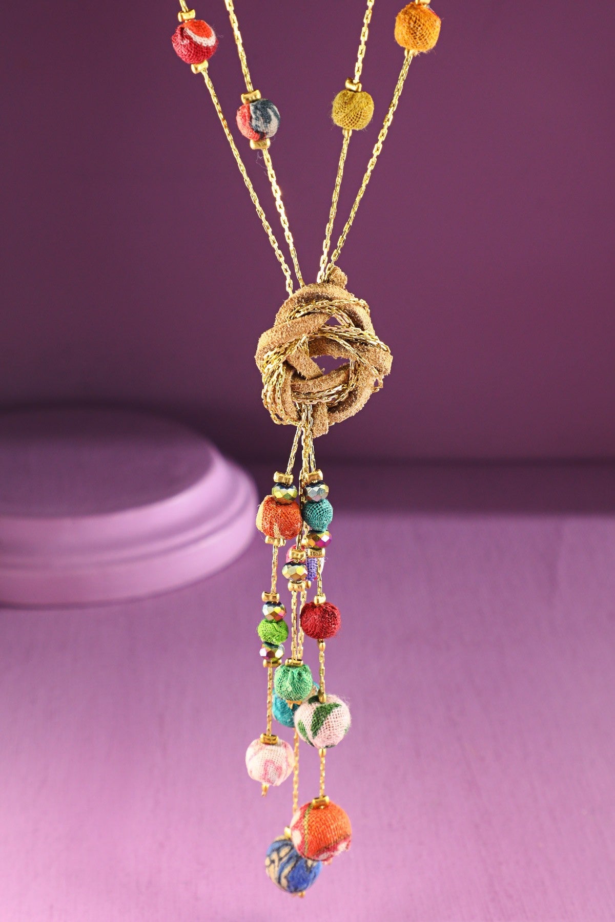 Tricking beaded necklace showcasing a bold knot pendant, blending texture and style.