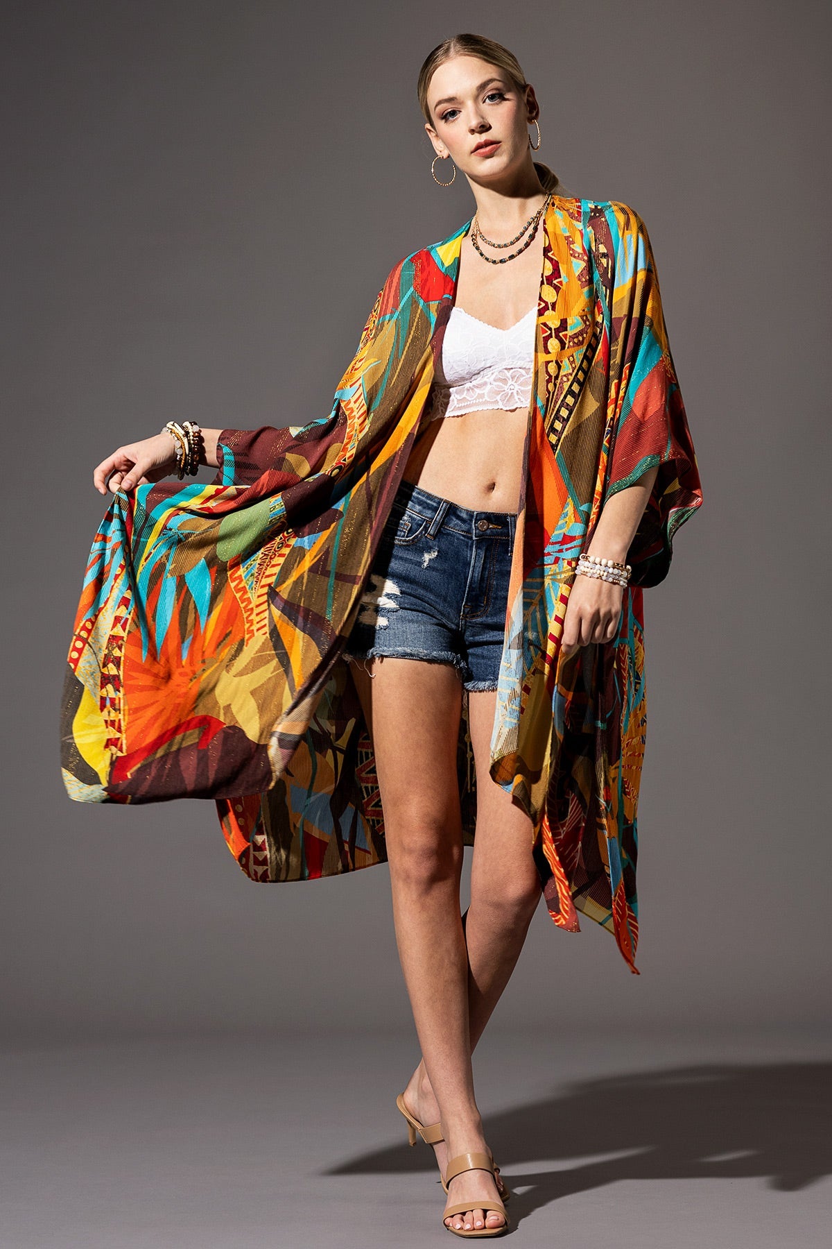 Embark on a journey of untamed style with our lightweight kimono, expertly tailored from Herringbone fabric for a touch of refinement. Immerse yourself in the vivid realm of colorful tropical prints harmonizing with ethnic patterns, culminating in a uniquely exquisite design. With a touch of wild charm, this kimono is bound to ignite your sense of adventure.