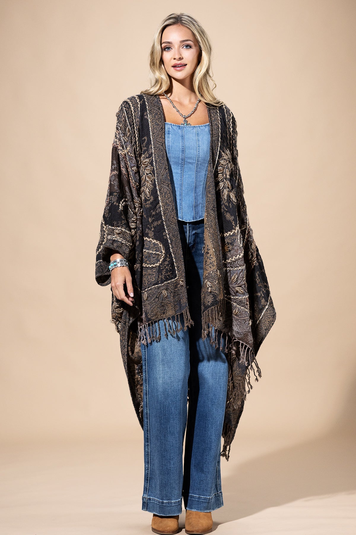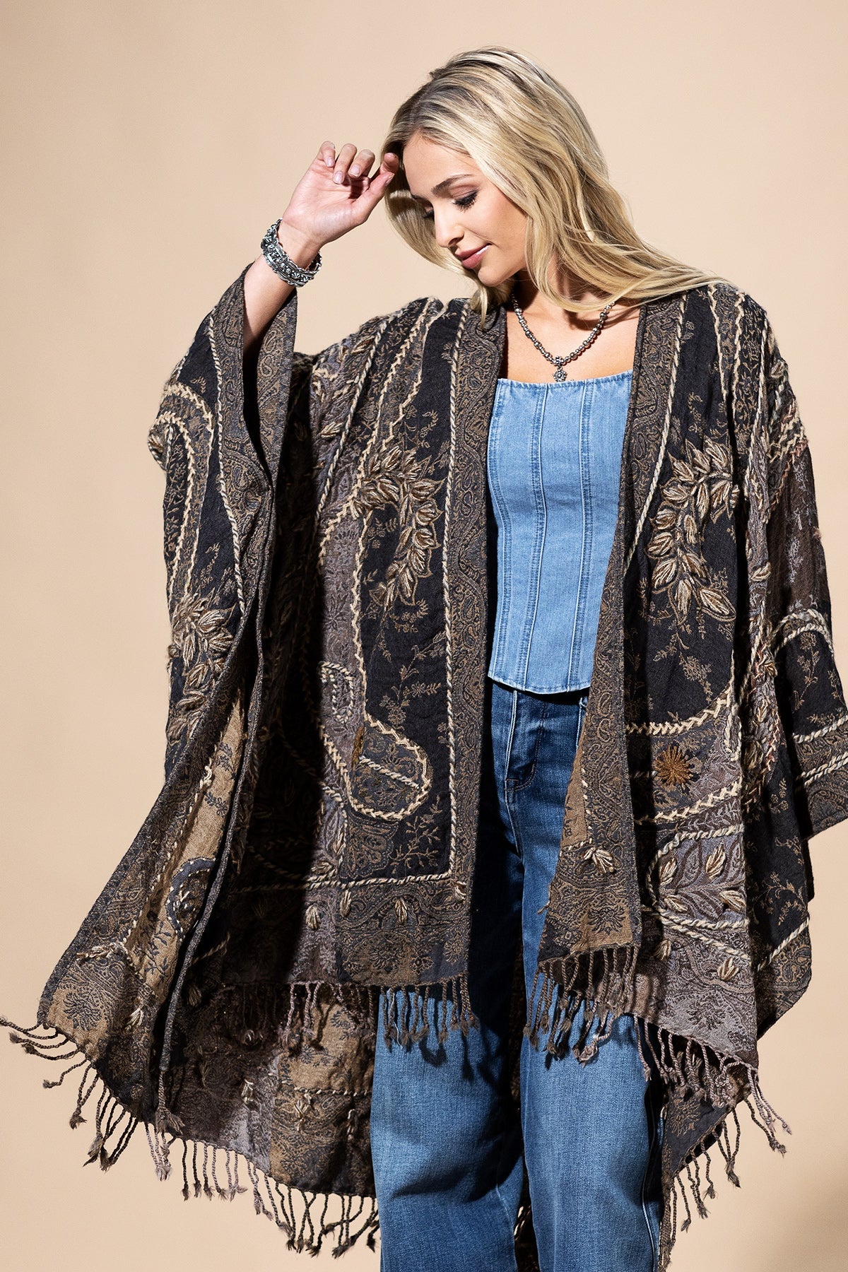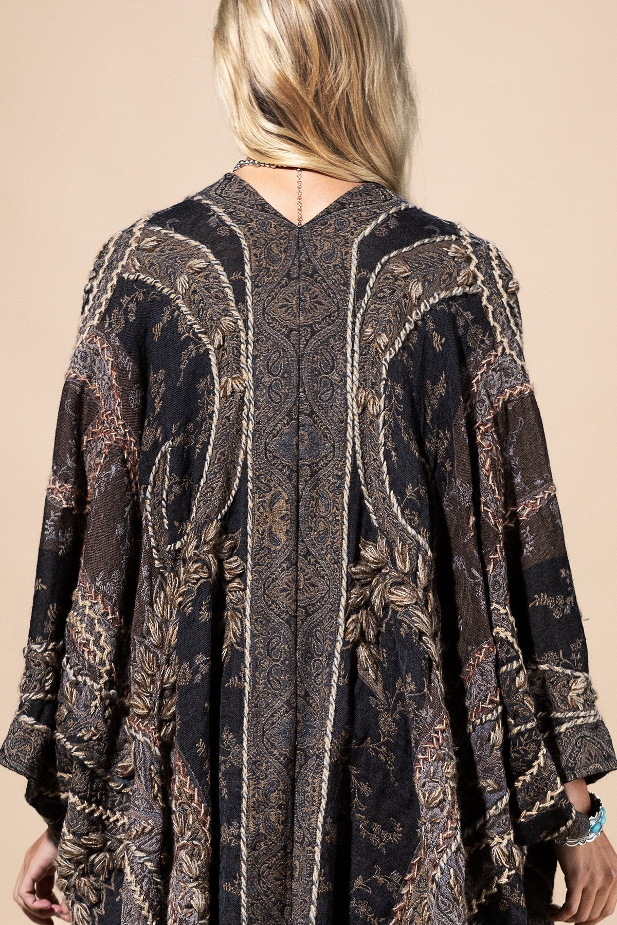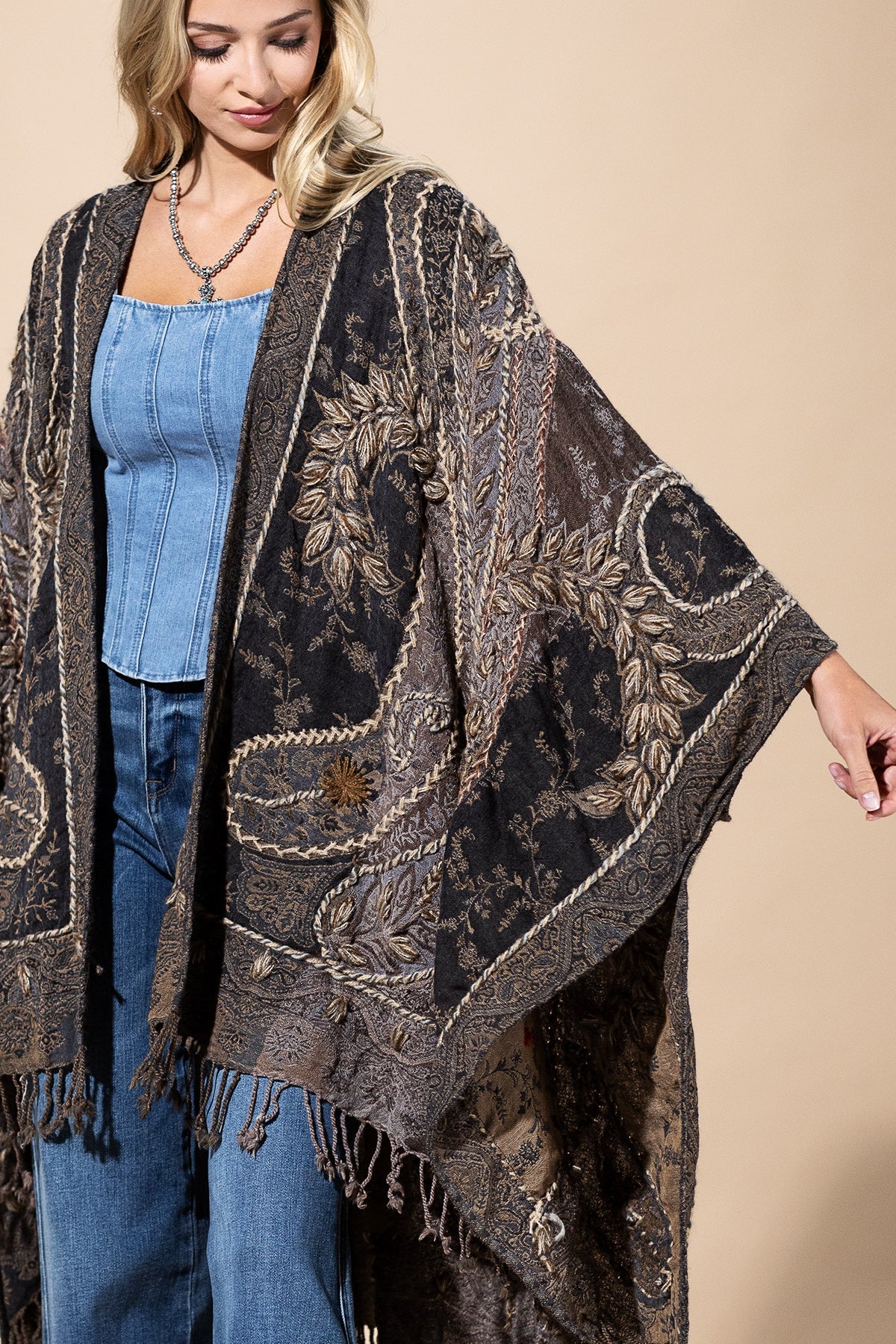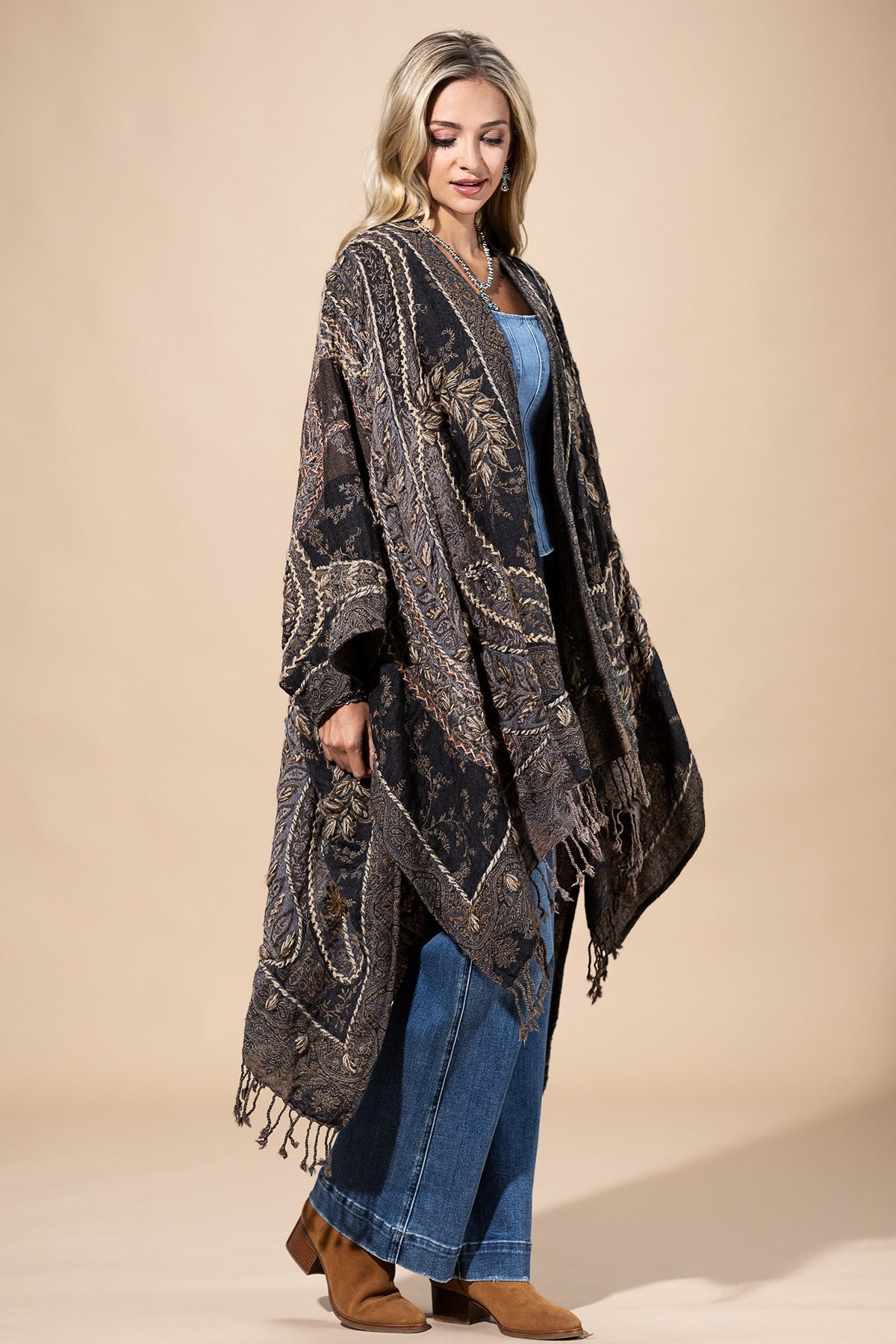 Wrap yourself in effortless elegance with this bohemian-inspired wool ruana. Woven from premium wool, it delivers natural warmth and softness while showcasing intricate embroidery and artisanal textured details. The open-front design and flowing drape make it the perfect layering piece, whether styled casually with denim or draped over eveningwear. A true wearable work of art, this embroidered wool ruana brings timeless boho charm to any outfit.